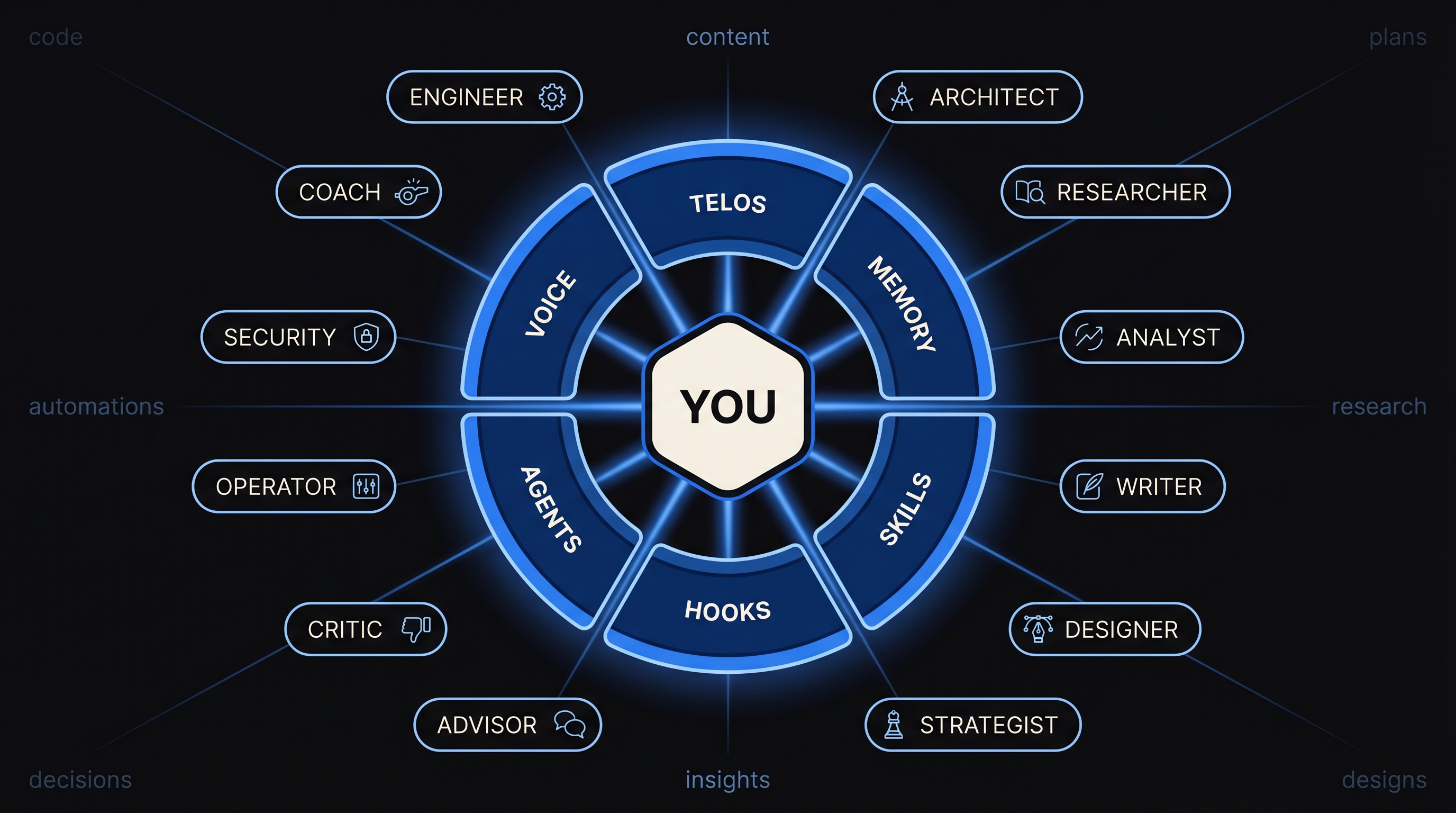 TELOS is the context engine that captures the whole of you and translates it into action — your identity, your pursuit, and what you're learning. It reconciles where you are today with where you're trying to go, continuously, file by file. Your Digital Assistant reads TELOS before it does anything else.